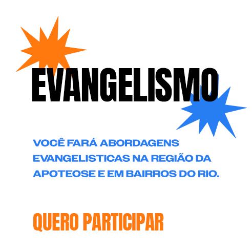Como você já sabe,  nossa equipe está dividida entre Evangelizadores e Intercessores. Portanto, durante a inscrição, você precisa escolher onde deseja atuar. Mas não se preocupe, em qualquer equipe sua vida abençoará o Rio de Janeiro.